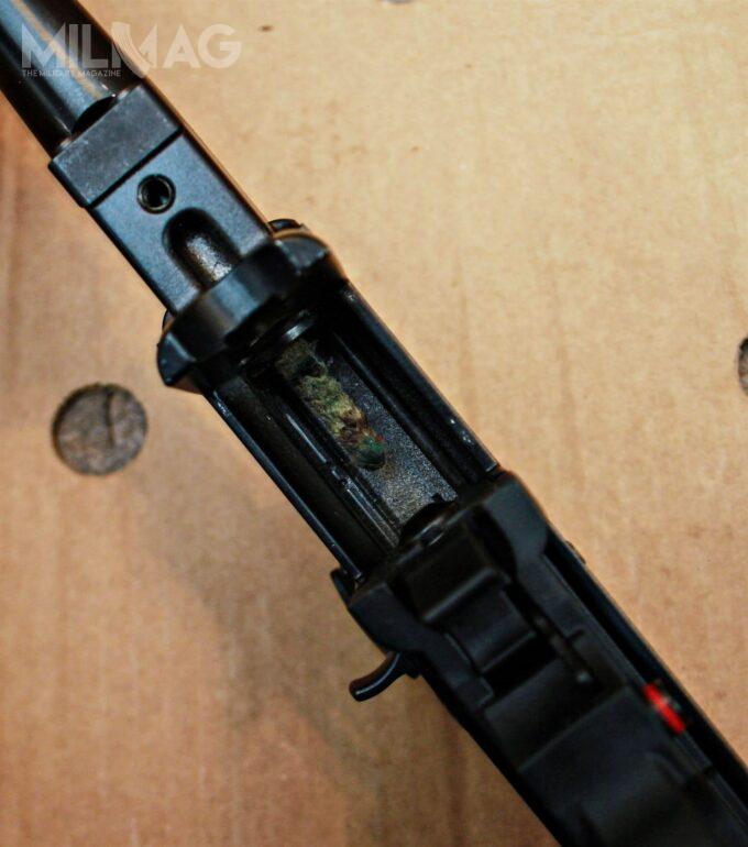Następnie przechodzimy do szkieletu broni. Tu najwięcej zaangażowania wkładamy w wyczyszczenie okolic komory nabojowej, która z powodu gromadzącego się tam nagaru bywa często mocno zapaskudzona. Warto w tym celu użyć szczoteczki z twardszym włosiem. Części ruchome szkieletu i wnętrze chwytu zazwyczaj wystarczy porządnie przetrzeć ściereczką do broni lub inną nasączoną środkiem zmiękczającym brud, ponieważ na tych elementach osadza się głównie tylko kurz i piasek.