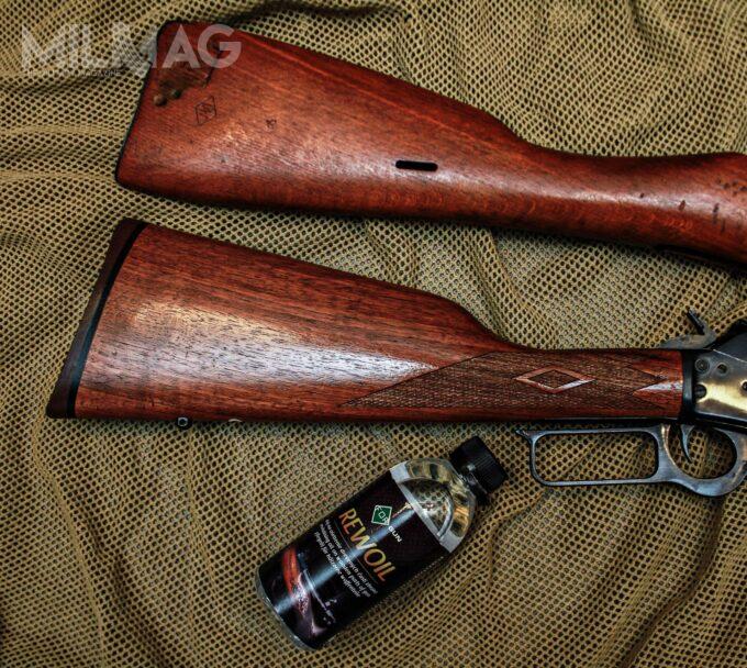 Drewniane fragmenty karabinów po użyciu produktu Rewoil. Drewno nabrało intensywniejszej barwy i połysku. Żelowa konsystencja ułatwia aplikację preparatu
