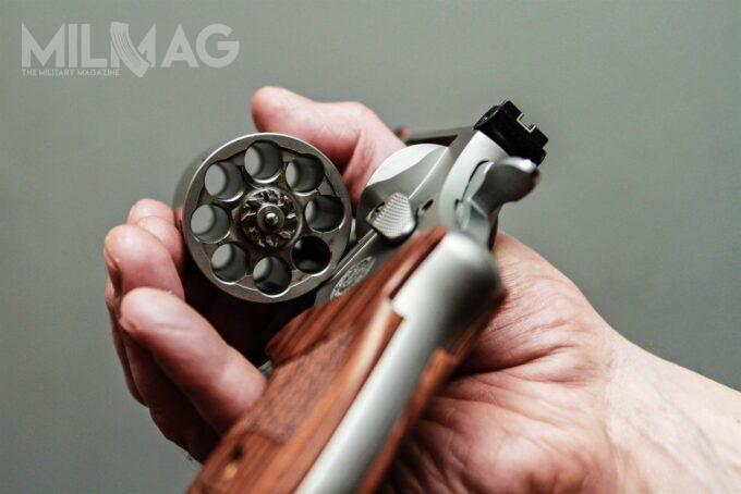 Kolejnym elementem, który wymaga podobnego traktowania, jest bęben chętnie zarastający sadzą, skutecznie umożliwiającą zasilenie go amunicją. Porządnie trzemy – tak jak przewód lufy – komory nabojowe bębna, zwracając uwagę, by nie uszkodzić powłok zewnętrznych rewolweru jeśli wykończone są oksydą lub np. matowione. W takim wypadku żrące pianki lepiej odłożyć na bok a skupić się na metodach mechanicznych wspomaganych syntetycznymi szczotkami i łagodnymi środkami konserwującymi. Z powodu uwarunkowań konstrukcyjnych, tj. z racji szczeliny pomiędzy wlotem lufy a czołem bębna, wyrzut gazów powoduje osadzanie się nieczystości również na tych częściach, a nawet na wewnętrznych ściankach szkieletu. Nie zapomnijmy wiec o przetarciu tych powierzchni.