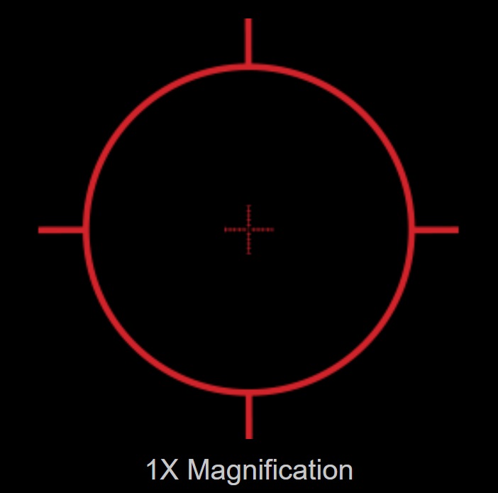 Pierwszym i najszybszym sposobem celowania jest użycie kropki lub centralnego punktu krzyża bez powiększenia. Przede wszystkim obserwacja przedpola a tym samym odnalezienie celu jest najłatwiejsze i najszybsze. Mamy największe pole widzenia i najlepszą świadomość sytuacyjną. Znak celowniczy jest najbardziej stabilny, co ułatwia oddanie szybkiego strzału. Drgania dają się we znaki wraz ze wzrostem powiększenia, co w niektórych przypadkach wręcz uniemożliwia oddanie strzału.