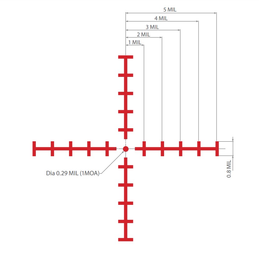 Poniżej graficzna wizualizacja krzyża SR-1 wraz z objaśnieniem wyskalowania w miliradianach.
