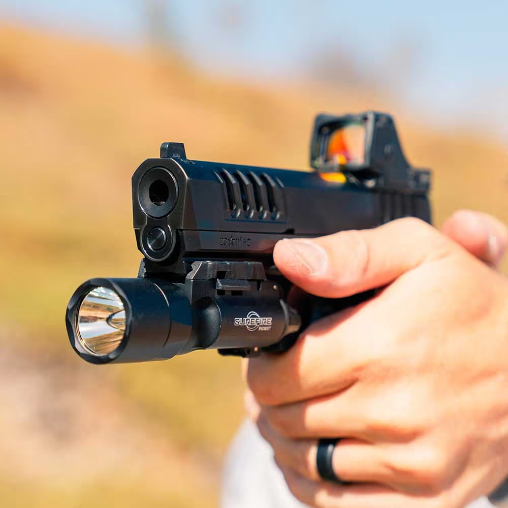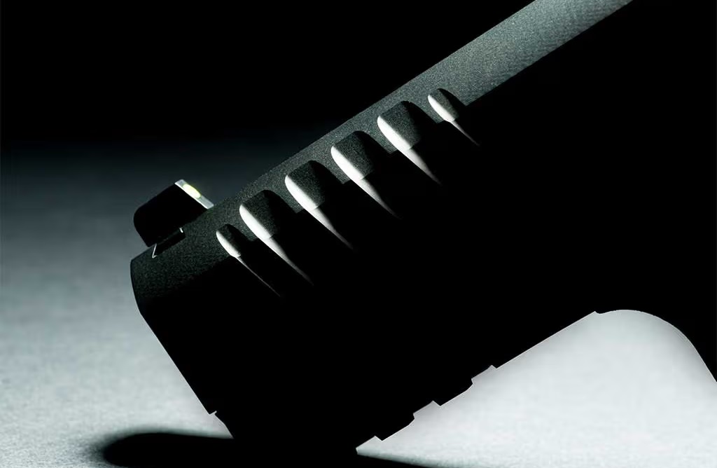 - przeprojektowana ergonomia: węższy chwyt, wyższa ostroga (beavertail), nacięcia zamka nowego typu,