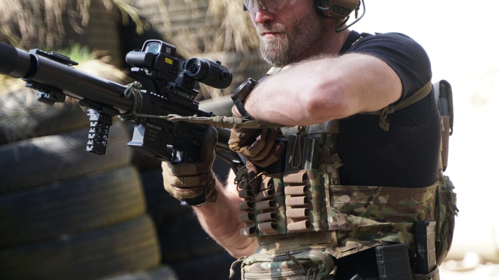Konstrukcja szelek sprawia, że prawie nie przeszkadzają podczas strzelania. Płaskie szelki przylegają do ciała, przez co bez problemu można dostawić kolbę, nie tracąc stabilności i czucia broni. O ile w warunkach idealnych na strzelnicy w jednej postawie (w 99% stojącej) każdy jest w stanie wypracować sposób strzelania, tak w sytuacji, podczas której to zmieniamy postawę strzelecką i dokładamy faktor czasu, zauważamy każdy element przeszkadzający w powtarzalnym łapaniu celu w celowniku.