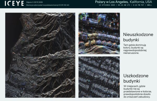 Polsko-fińska spółka ICEYE wykonała 14 stycznia 2025 zobrazowania radarowe pożarów w hrabstwie Los Angeles za pomocą satelitów radarowych z syntetyczną aperturą (SAR).