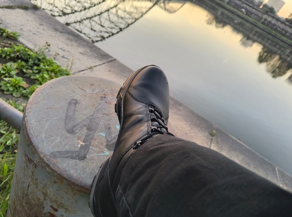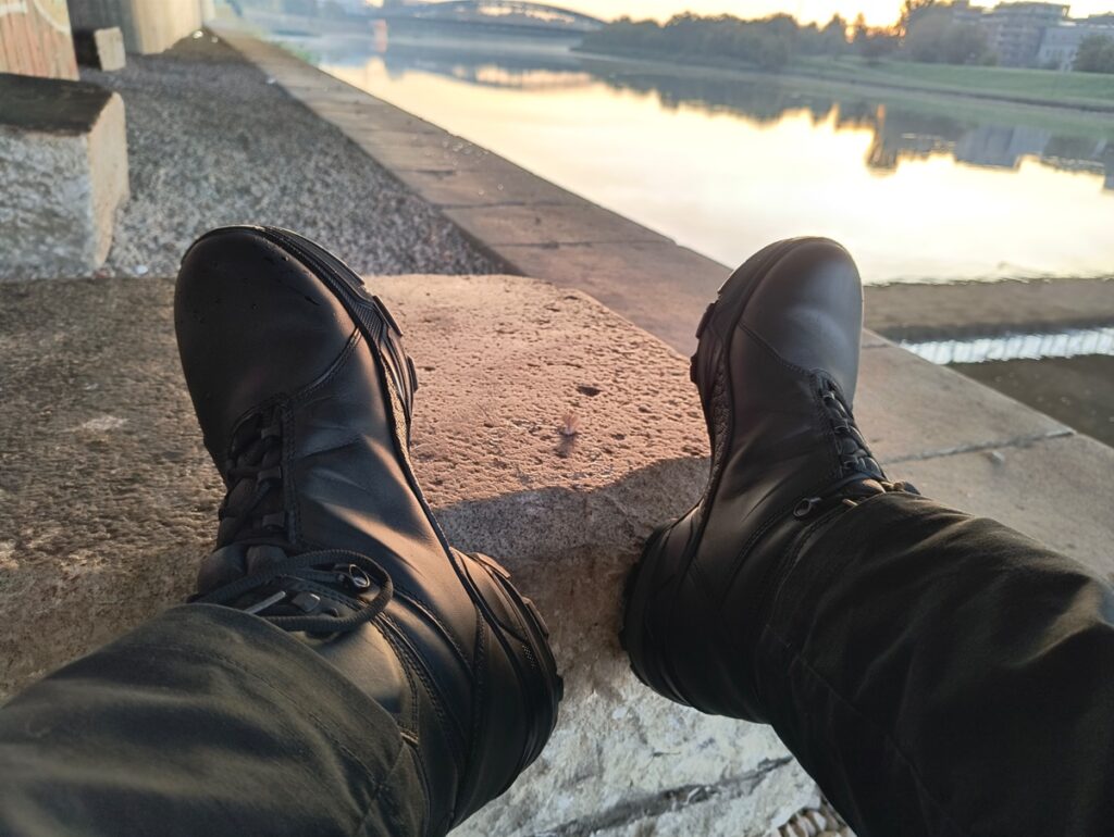 Zacząłem w nich chodzić na co dzień. Jako że moja droga do pracy prowadzi przez miasto, a z mojego wyboru ponad połowa to spacer, to było kilka okazji pochodzić po różnym podłożu. Mam również nieco spłaszczoną stopę, tak płaskostopie poprzeczne i nieco się obawiałem o wygodę chodzenia. Ale odważnie poszedłem. Chodnik, asfalt czy beton, trawa, jakieś kamyki i tym podobne nie robią na butach żadnego wrażenia, bo i co strasznego miałyby zrobić. Słowem amortyzacja na dobrym poziomie. Część mojego spaceru to okolica bulwarów przy Wiśle w Krakowie, więc chwilę pochodziłem i chwilę posiedziałem 😉 Trochę wszedłem na jakąś metalową konstrukcję, jakby kiedyś trzeba było z czegoś takiego obadać przedpole, faktycznie się nie ślizgały.