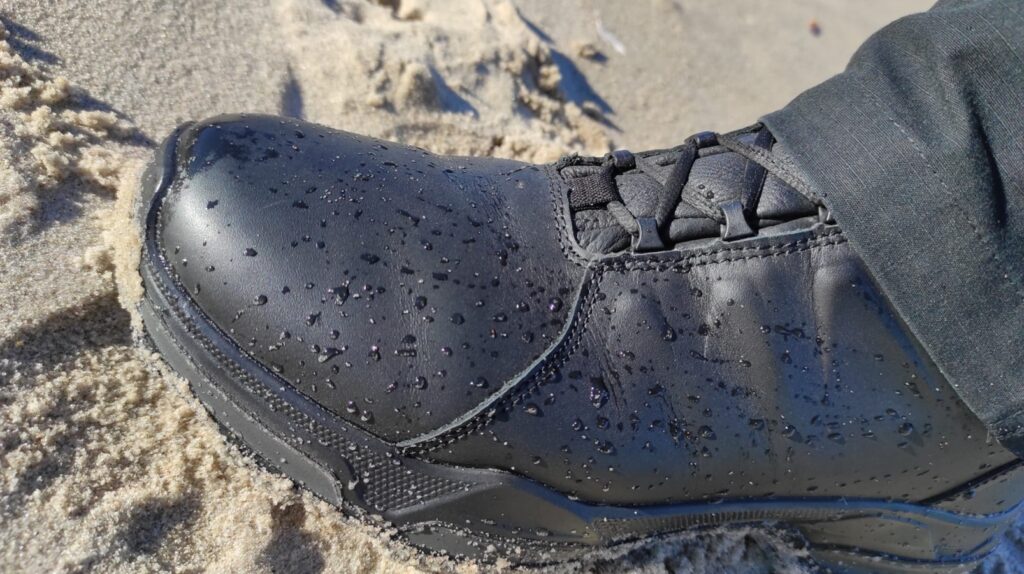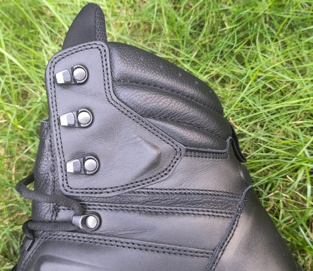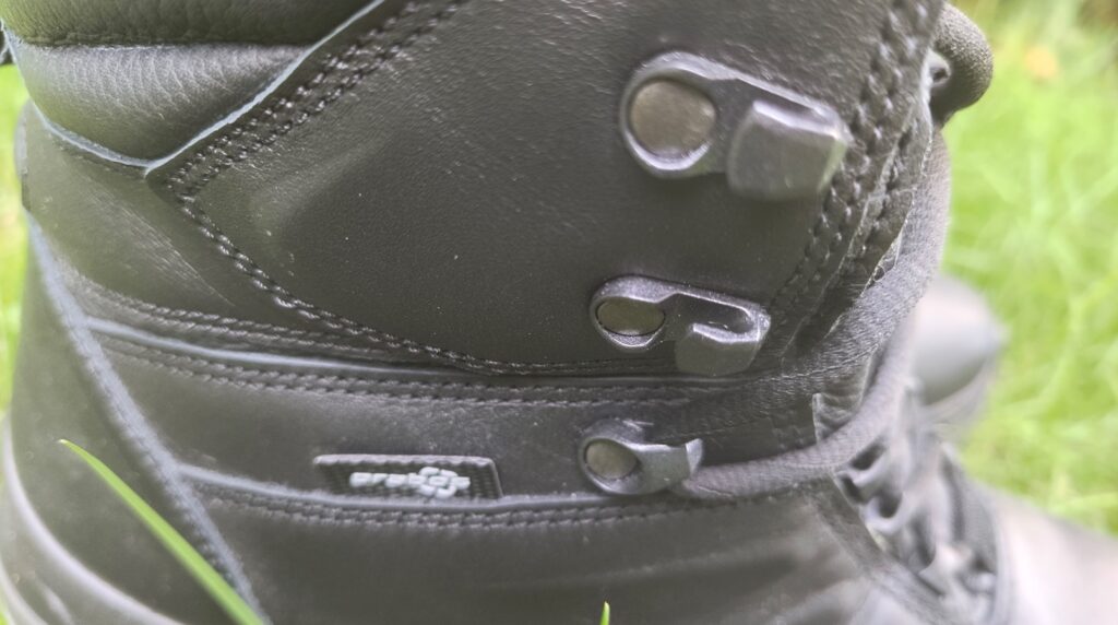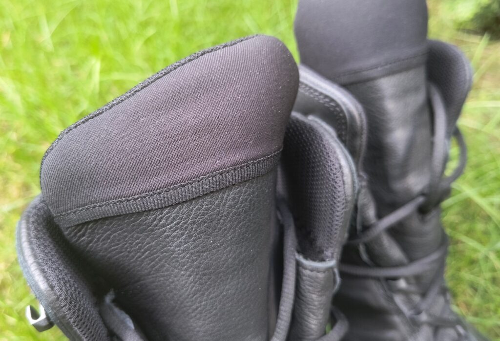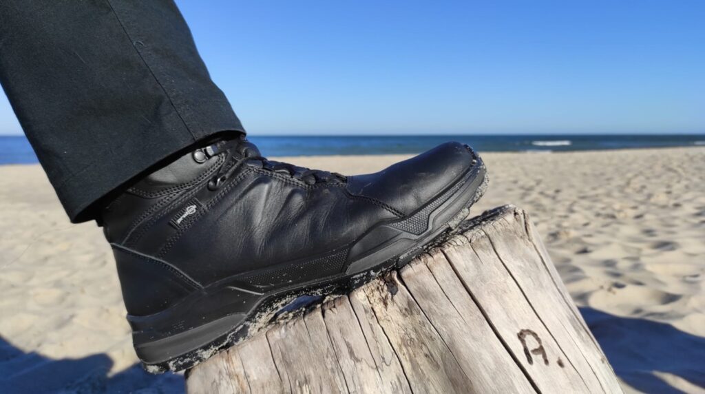 Cholewa buta jest wysoka, wykonano ją z naturalnej licowej skóry o podwyższonej oddychalności z hydrofobową powłoką. Mimo wysokości buty nie sprawiają wrażenia ciężkich i masywnych i rzeczywiście są lekkie. Jeden but w rozmiarze 45 waży około 780 g według mojej wagi kuchennej. Nie pytajcie… Lekkość obuwia sprawia, że zapomina się, że mamy te buty na nogach. Miałem wrażenie, że są to buty turystyczne lub do chodzenia na co dzień, bo naprawdę nie ma to toporności.