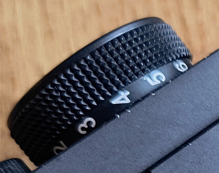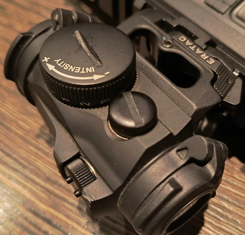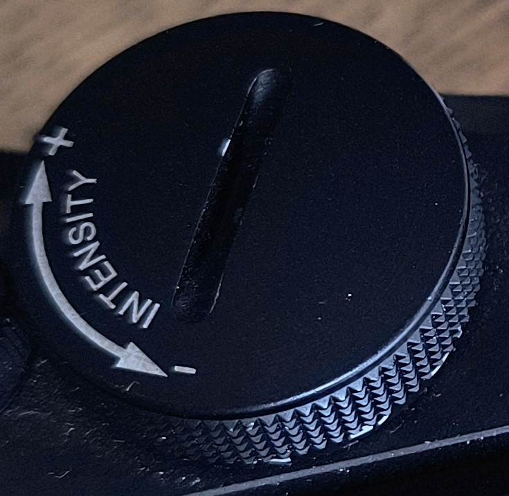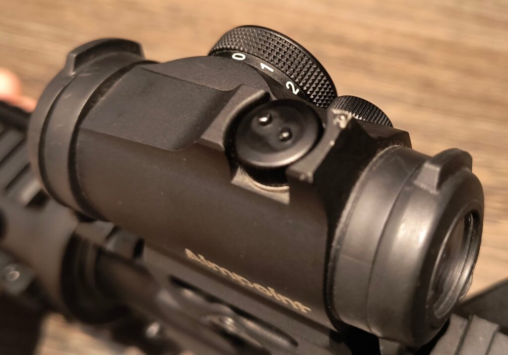 Jeśli chodzi o ustawienie jasności kropki, to mamy aż 12 poziomów świecenia. Do tej czynności służy nam duże pokrętło z prawej strony Aimpoint Micro H-2, na którym znajdziemy cyfry informujące o aktualnym poziomie jasności oraz napis INTENSITY, a także strzałkę ze znakami plus i minus, w razie jakby ktoś miał problem z cyferkami.