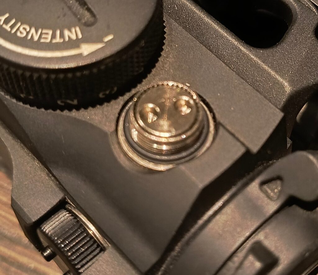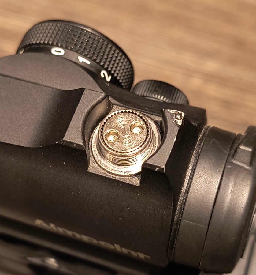 Gdyby się jednak okazało, że pomimo moich zabiegów, to znaczy pomimo przypadkowych zbiegów okoliczności, kropka jednak przemieściła się w inne miejsce, to bardzo łatwo możemy przywrócić punkt celowania. Operacja sprawdzona na początku, podczas początkowego ustawiania Aimpoint Micro H-2 na montażu Recknagel ERA TAC i ustawianiu zera. Mamy tu do czynienia z dwoma śrubami, które są osłonięte zakrętkami. Górna zakrętka ma dwa wystające elementy – bolce.