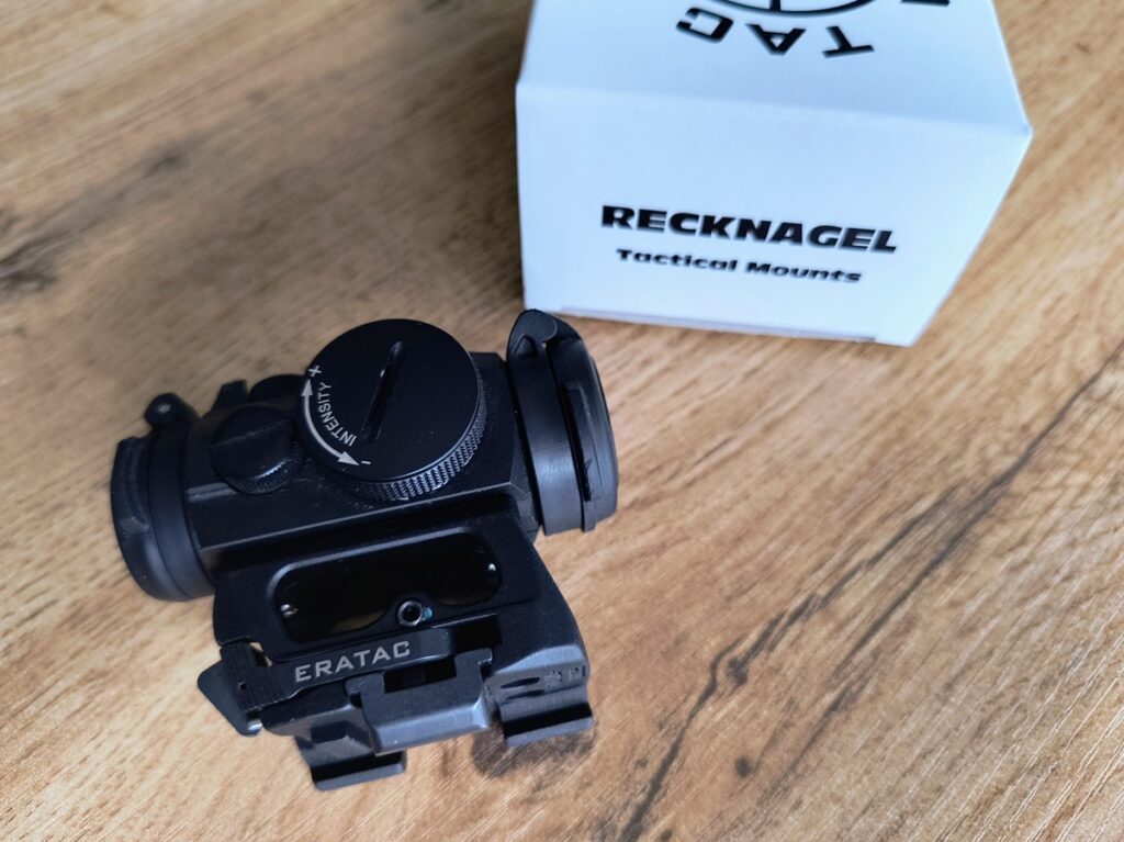 Jak się zamontowało, to trzeba sprawdzić, jak się przez taki kolimator patrzy. Jako że pudełko od montażu Recknagel ERA TAC ma znaczek, który aż się prosi, żeby postawić na nim kropkę 2 MOA.