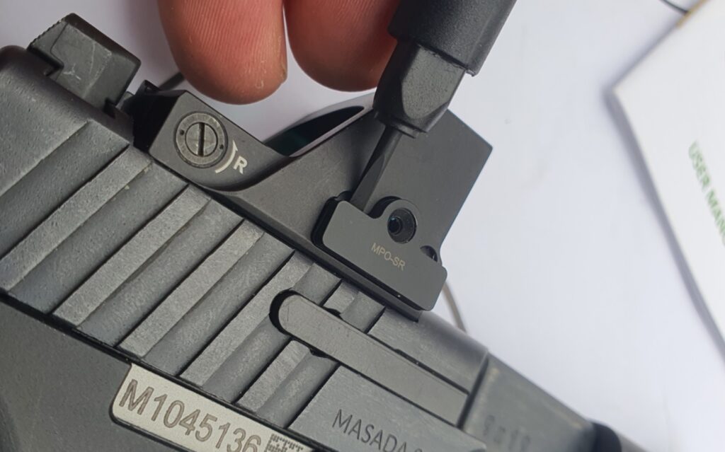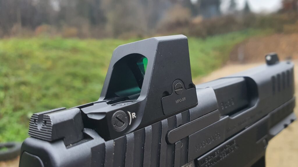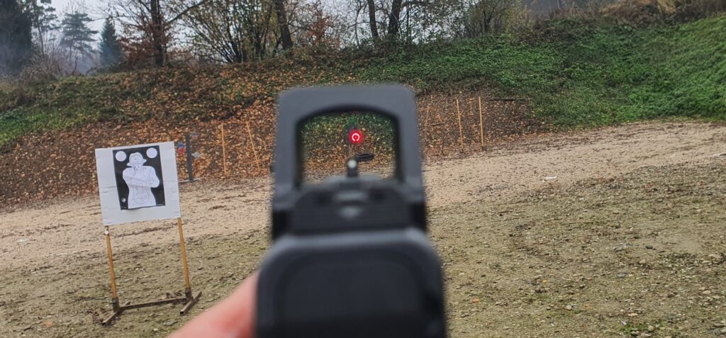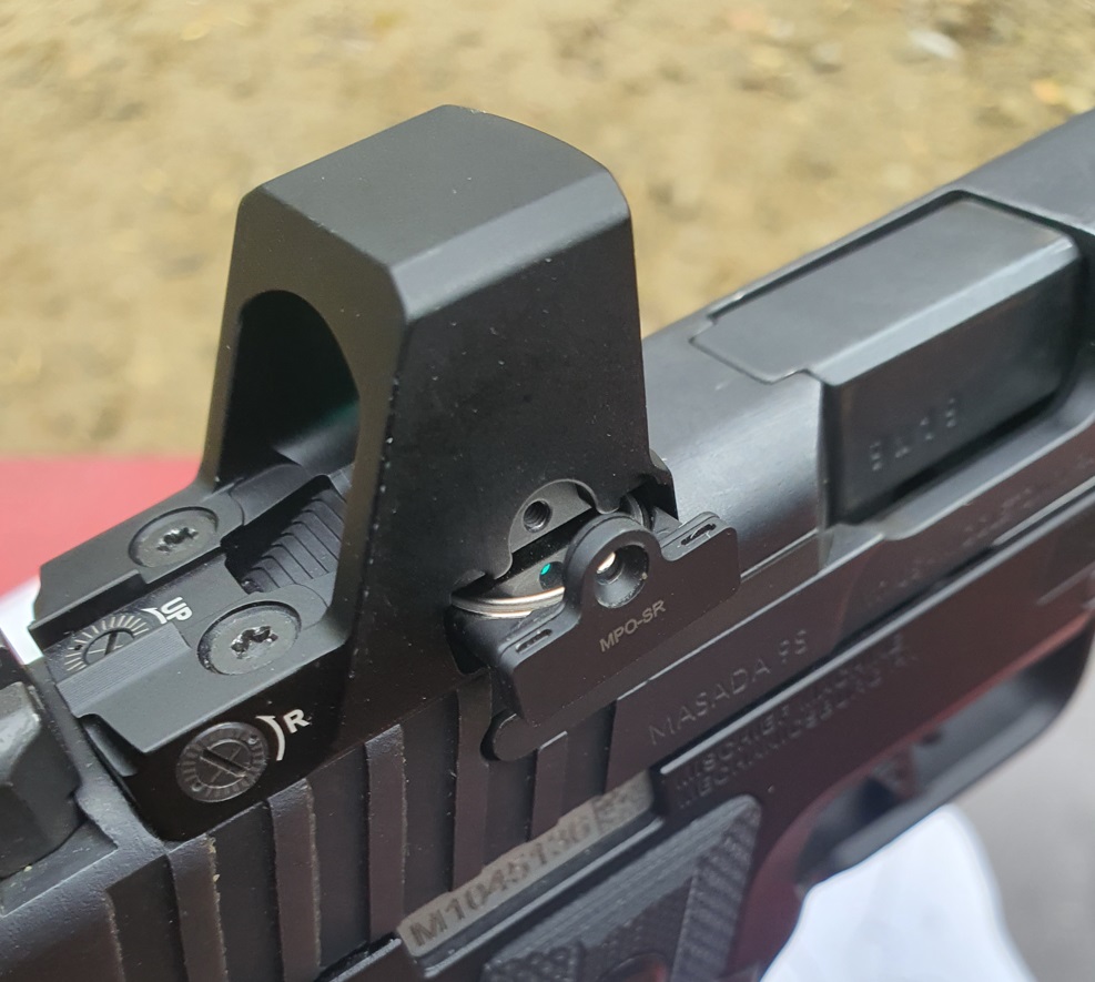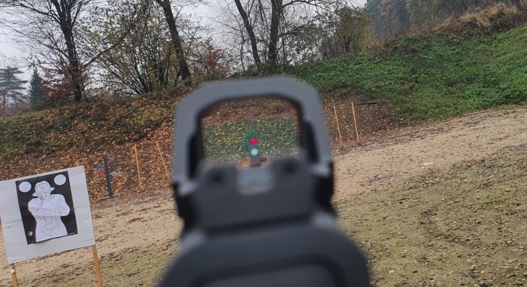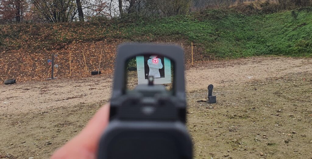 W wersji F było zdecydowanie lepiej – podświetlenie znaku celowniczego ma mniejsze natężenie i jest lepiej dostosowane do warunków otoczenia. Sam rozmiar celownika również zdecydowanie poprawia pole widzenia i możliwość szybkiego namierzenia celu. Oczywiście kwestia wersji jest uzależniona od pistoletu z jakiego korzystamy, ponieważ MPO-S idealnie pasuje do Masady 9S i jeśli mamy na celu użytkowanie pistolety subkompaktowego, to z takiego celownika będziemy korzystać.