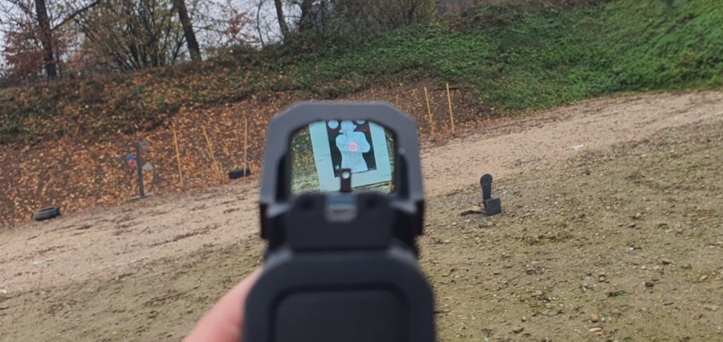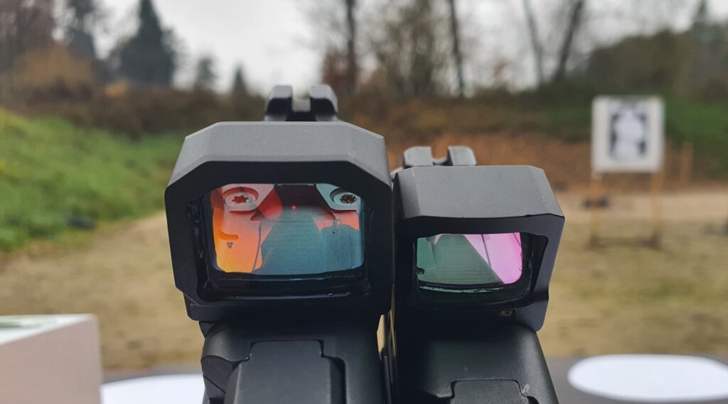 I chociaż są tak podobne, natrafiłem na pierwszą różnicę między wersjami S i F. Tryb auto w większej wersji F jak dla mnie podświetlał znak celowniczy lepiej, dostosowując moc podświetlenia do panujących warunków. Wersja S była dużo mocniej podświetlona, co powodowało zasłonięcie celu uniemożliwiające oddanie celnego strzału. Podczas strzelania na dystansie 12 m, identyfikacja konkretnego punktu celowania o rozmiarze 2 cm była niemożliwa. Duży okrąg o rozmiarze 33 MOA dawał tak mocną poświatę, że niepomalowany cel stalowy lekko zlewający się z otoczeniem stał się bardzo trudny do rozpoznania, a mówimy o dystansie 25 m. Ponadto niewielki rozmiar soczewki w masywnej obudowie mocno ogranicza pole widzenia.