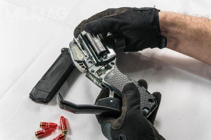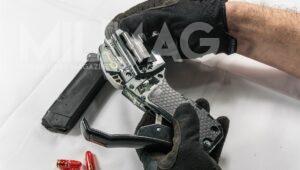 Później trzeba wyciągnąć popychacz, co odblokowuje podajnik amunicji