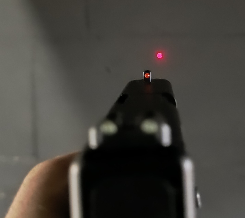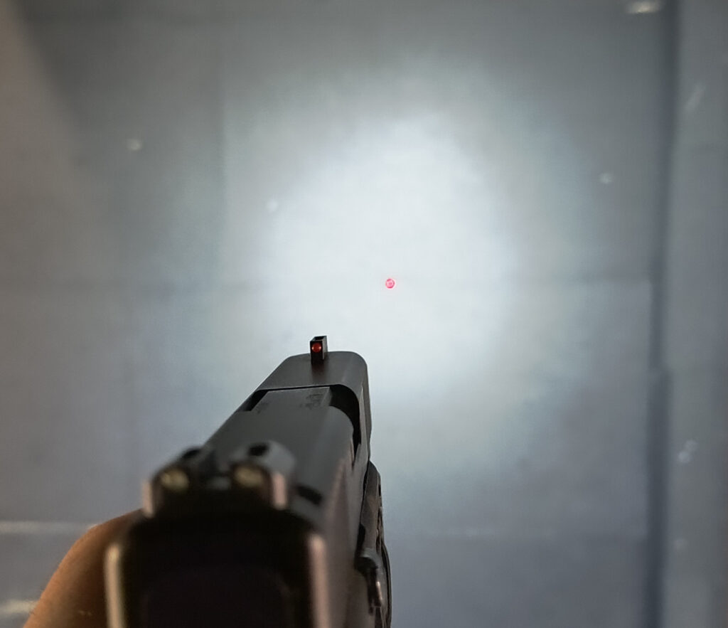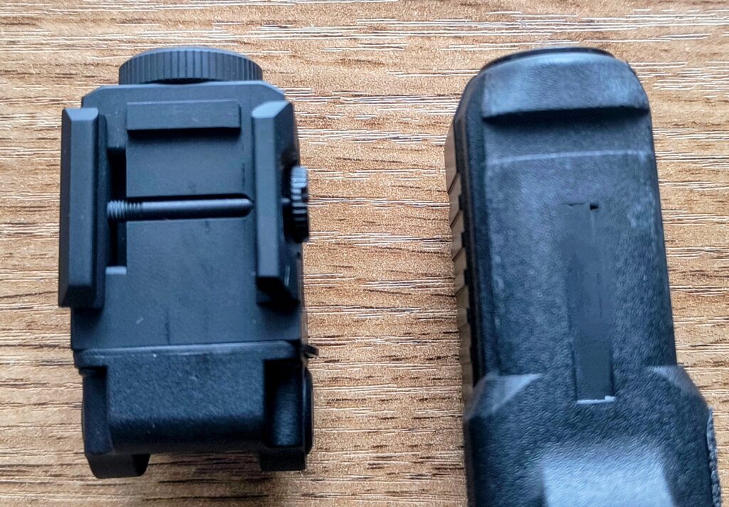 Korpus wykonano z lekkiego i wytrzymałego aluminium lotniczego poddanego anodyzacji. Częściowo, tu gdzie włączniki, aluminium cechuje się fakturą plastiku z mojego Glocka. Obustronny gumowy przełącznik umożliwia łatwy dostęp do zmiany trybu świecenia z białego światła na laser lub białe światło z laserem. Działa z bardzo dobrze wyczuwalnym klikiem, swoją drogą również przyjemnym. Z początku miałem wątpliwości co do jego umieszczenia i praktyczności, ale jak trochę poklikałem, to stało się dość intuicyjne. Z lewej strony mamy 4 śruby do regulacji wiązki lasera w pionie i poziomie. Regulacji dokonujemy dołączonym imbusem. A, no i trzeba mieć słownik, bo góra, dół, prawo, lewo jest po angielsku i w skrócie 🙂 Z poziomu ustawień z pudełka nie musiałem długo kręcić śrubami, żeby nakierować wiązkę na żądany punkt, ale słownik się przydał 🙂