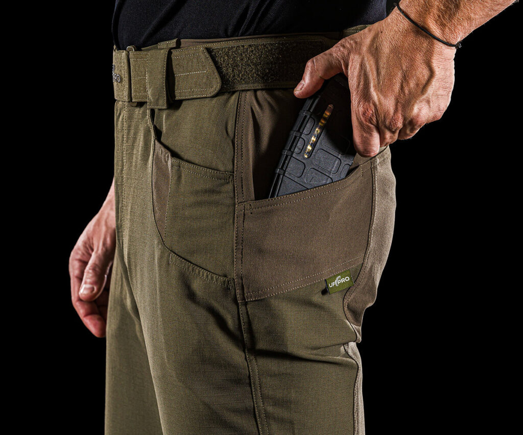 - 2 kieszenie boczne Tuck Lock o rozciągliwej konstrukcji, zabezpieczające takie przedmioty jak portfel czy magazynek karabinowy.