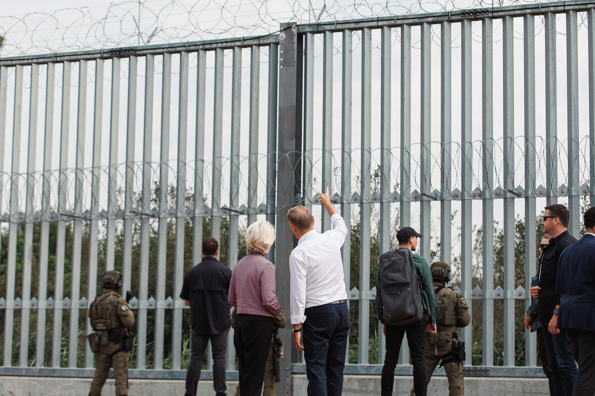 Po odprawie ze służbami, Donald Tusk i Ursula von der Leyen obejrzeli miejsce składowania elementów do budowy Tarczy Wschód, a potem zmodernizowaną, stalową zaporę na granicy, przy której – na zakończenie spotkania odbyła się konferencja prasowa.