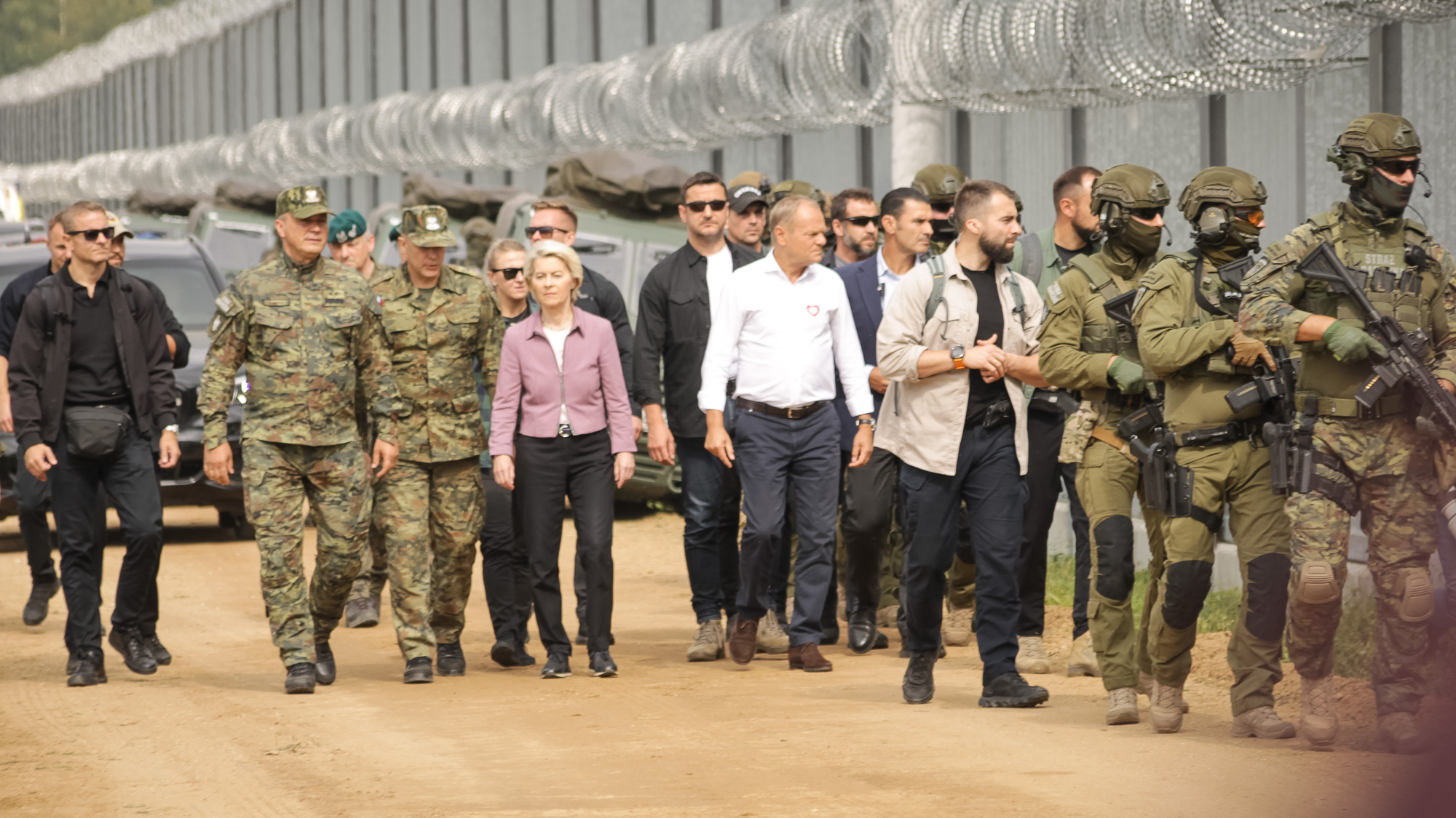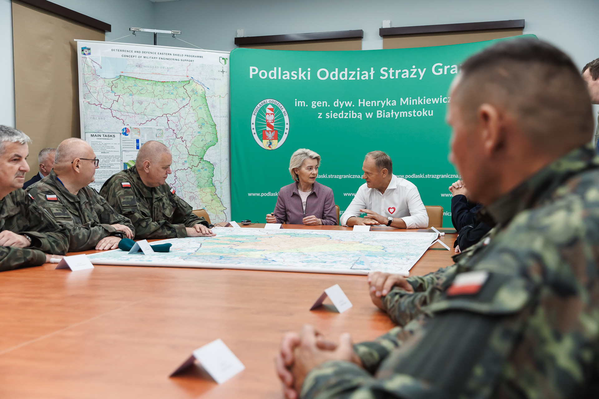 Zero ustępstw, musimy pokazać prawdziwą, europejską determinację – podkreślił szef polskiego rządu. Wizyta szefowej KE na granicy Polski i Białorusi odbywa się w 45. rocznicę utworzenia Solidarności. Tak, jak wówczas Polacy, tak obecnie Zachód musi być twardy i zdecydowany wobec kolejnej wersji „imperium zła”. W spotkaniu z Ursulą von der Leyen uczestniczyli także m.in. Minister Spraw Wewnętrznych i Administracji Marcin Kierwiński oraz Wiceminister Obrony Narodowej Cezary Tomczyk. Ze strony wojska w odprawie uczestniczyli zastępca szefa sztabu generalnego wojska Polskiego gen broni Stanisław Czosnek, szef zarządu inżynierii wojskowej DG RSZ gen dyw. Marek Wawrzyniak. W odprawie brała też udział kadra dowódcza SG i Policji.