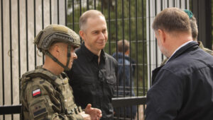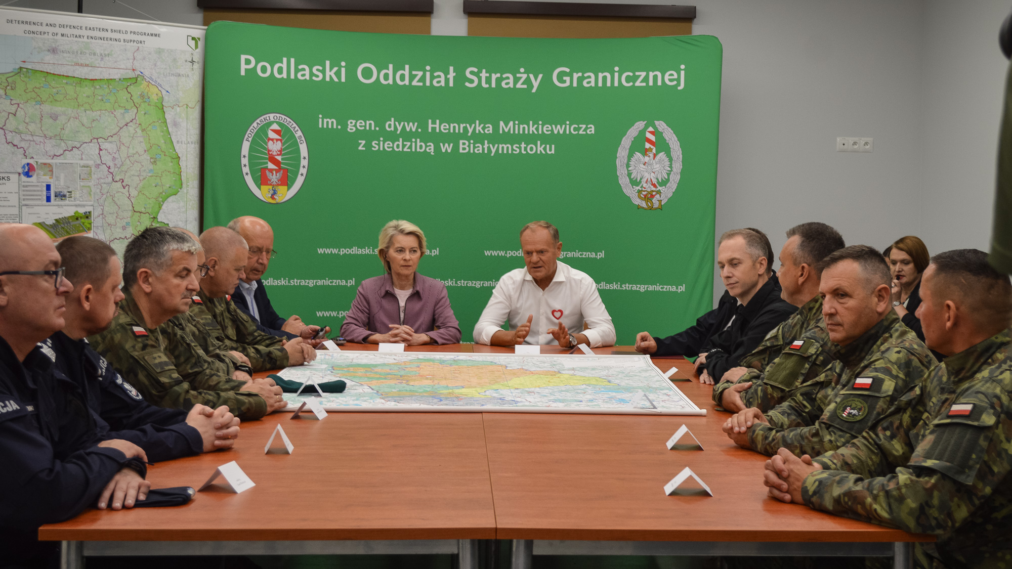Zero ustępstw, musimy pokazać prawdziwą, europejską determinację – podkreślił szef polskiego rządu. Wizyta szefowej KE na granicy Polski i Białorusi odbywa się w 45. rocznicę utworzenia Solidarności. Tak, jak wówczas Polacy, tak obecnie Zachód musi być twardy i zdecydowany wobec kolejnej wersji „imperium zła”. W spotkaniu z Ursulą von der Leyen uczestniczyli także m.in. Minister Spraw Wewnętrznych i Administracji Marcin Kierwiński oraz Wiceminister Obrony Narodowej Cezary Tomczyk. Ze strony wojska w odprawie uczestniczyli zastępca szefa sztabu generalnego wojska Polskiego gen broni Stanisław Czosnek, szef zarządu inżynierii wojskowej DG RSZ gen dyw. Marek Wawrzyniak. W odprawie brała też udział kadra dowódcza SG i Policji.