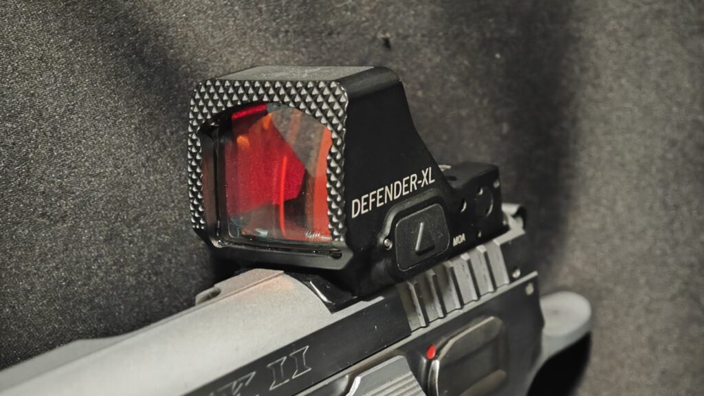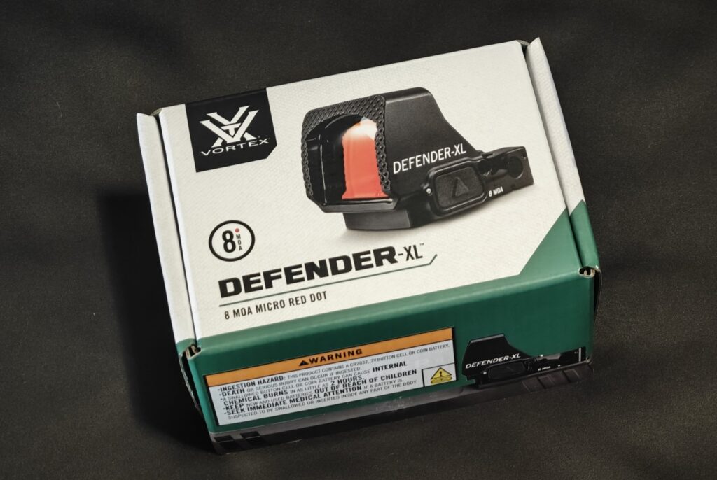 Defender XL, jak sama nazwa wskazuje, jest największym kolimatorem z rodziny. Do dyspozycji dostajemy okno o wymiarach 25,5 mm x 23,3 mm. Dostępne są warianty z czerwoną kropką w rozmiarach 2, 5 i 8 MOA, oraz zieloną 3 MOA – producent jak na razie nie zdecydował się na wprowadzenie wersji Multi Reticle pozwalającej na zmianę wyświetlanego punktu. Regulacja odbywa się w zakresie 115 MOA w poziomie i 120 MOA w pionie. Soczewkę zabezpieczono powłoką Armortek, chroniącą przed zarysowaniami i innymi czynnikami zewnętrznymi.
