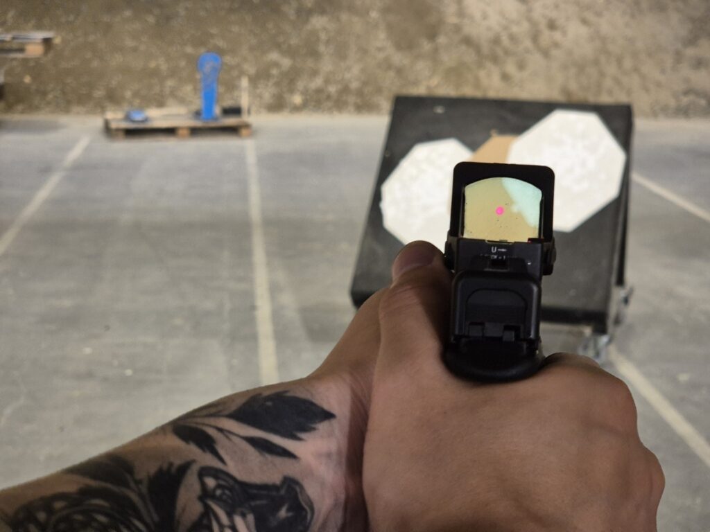 Do testów wybrałem wersję z punktem 8 MOA – przy większej kropce łatwiej przychodzi mi znalezienie jej przy niższej jasności, co ułatwia strzelanie ze skupieniem wzroku na celu. Miałem również okazję postrzelać z kropki 5 MOA. W obu przypadkach wyświetlany znak był nieskazitelnie okrągły i pozbawiony jakichkolwiek zniekształceń. Powłoka antyrefleksyjna nadaje pomijalnie małe niebieskawe zabarwienie obrazu w oknie, nieodbiegające w żaden sposób od większości topowych produktów na rynku. Efekt jest na tyle nierzucający się w oczy, że zwróciłem na niego uwagę dopiero podczas pisania recenzji, kiedy przypomniało mi się, jak widoczne było to w używanym przeze mnie poprzednio kolimatorze pewnego „polskiego” producenta.