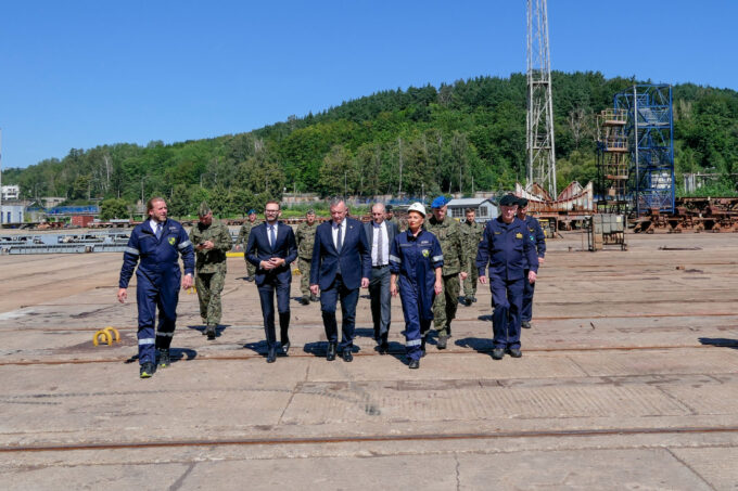 Podczas wizyty, prezes PBZ Stoczni Wojennej Marcin Ryngwelski z członkiem zarządu Beatą Koniarską zaprezentowali gościom postępy prac na budowie pierwszej z trzech fregat programu Miecznik oraz inwestycji związanych z tym strategicznym przedsięwzięciem.