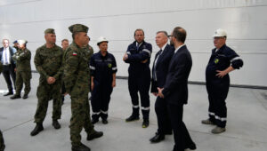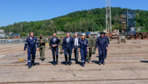 Podczas wizyty, prezes PBZ Stoczni Wojennej Marcin Ryngwelski z członkiem zarządu Beatą Koniarską zaprezentowali gościom postępy prac na budowie pierwszej z trzech fregat programu Miecznik oraz inwestycji związanych z tym strategicznym przedsięwzięciem.