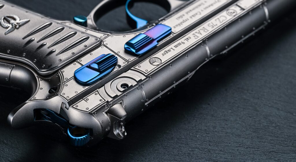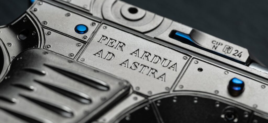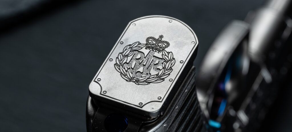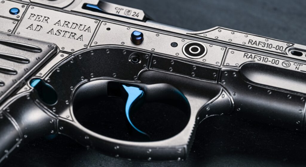 Zdobienie pistoletu zwieńcza odznaka pilota RAF na stopce magazynka, srebrny pierścień na prawej stronie szkieletu oraz motto RAF Per ardua ad astra – Przez trudy do gwiazd. Walory estetyczne dodatkowo zwiększają manipulatory w wykończeniu Rainbow Blue.