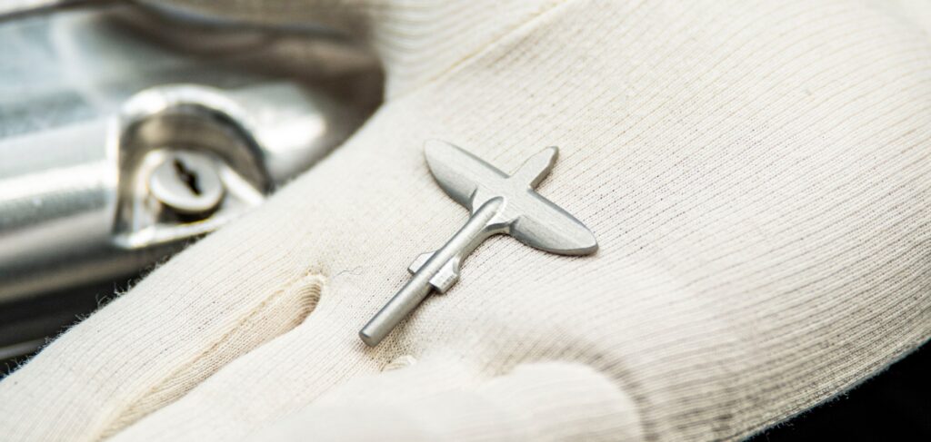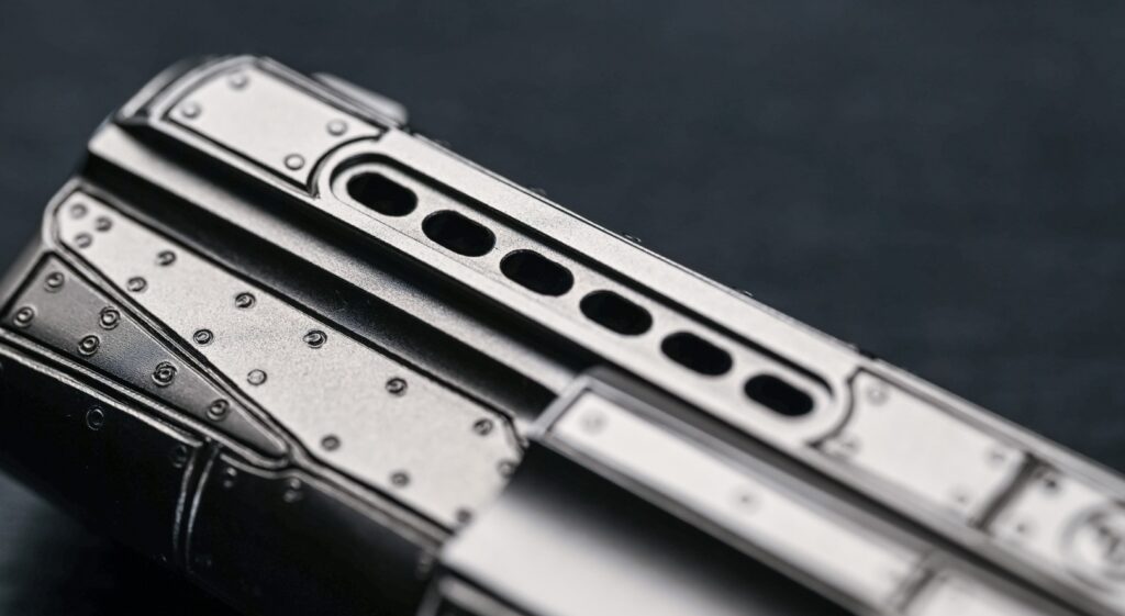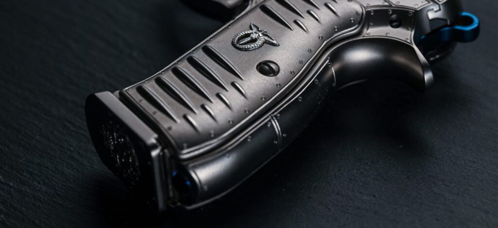 Zamek pistoletu cechuje się otworami inspirowanymi wydechami silnika Rolls-Royce Merlin, którego dźwięk na zawsze pozostał w pamięci pilotów Spitfire’ów. Powierzchnia całej broni nawiązuje do nitowanych paneli kadłuba, a okładziny chwytu naśladują skrzydła Spitfire’a. Na lewej okładce znajduje się srebrna, czechosłowacka odznaka pilota-obserwatora. Nacięcia na tyle zamka składają się z kilku okręgów, naśladując znak identyfikacyjny Royal Air Force.