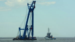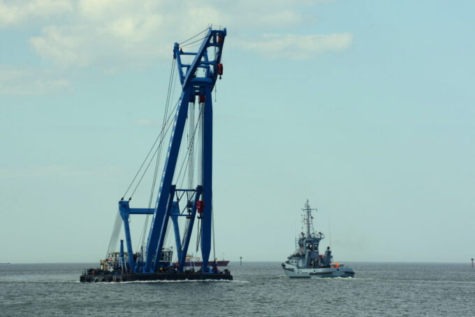 Zaraz po wyjściu z gdańskiego portu na torze podejściowym Przemko minął się z dźwigiem pływającym Conrad Consul, za pomocą którego 5 miesięcy temu – 17 grudnia ub. roku – został zwodowany. / Zdjęcia: Przemysław Gurgurewicz