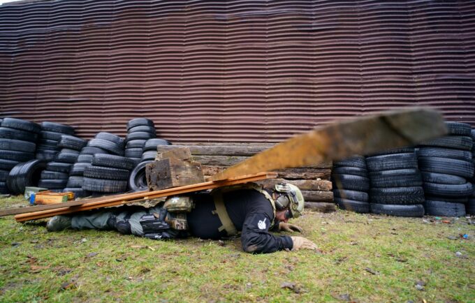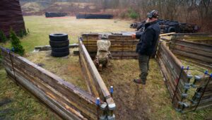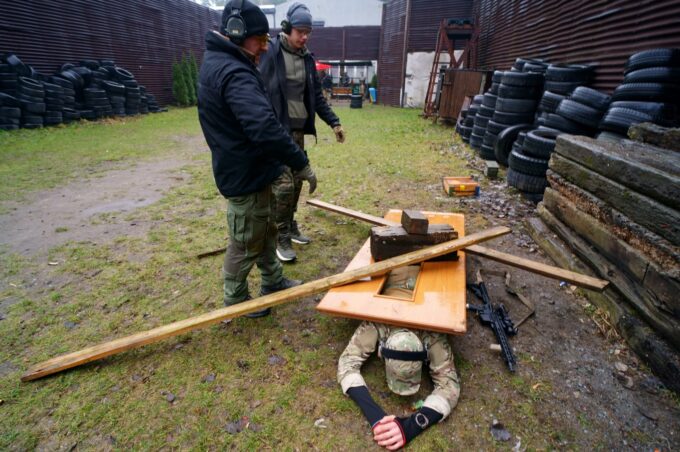 Zawodnicy rozpoczynali piąty tor będąc przygniecionymi drzwiami, deskami i innymi przedmiotami w miejscu wybuchu. Dodatkowym utrudnieniem było zasłonięcie oka prowadzącego, symulując jego uraz. Po sygnale startowym należało wygrzebać się spod zwałowiska, chwycić leżący obok karabin na zawieszeniu, przemieścić się do osłon i zacząć zza nich ostrzeliwać cele pistoletowe. Następnie chowano pistolet, brano skrzynie z amunicją i ostrzeliwano cele karabinowe.